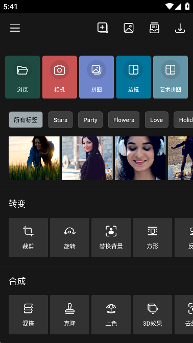 4、魔术工具,包括以下突出特点:混合功能,使用大量蒙版,背景和混合模式将两个图像组合在一起; Color Splash旨在突出照片上的物体;克隆图章用于复制对象,更改或删除背景;形状编辑器有助于将照片与形状,纹理和背景的多种变体相结合。