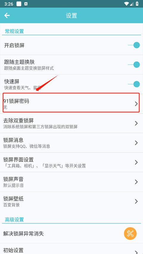 2、进入设置界面之后找到91锁屏密码选项,点击进入;