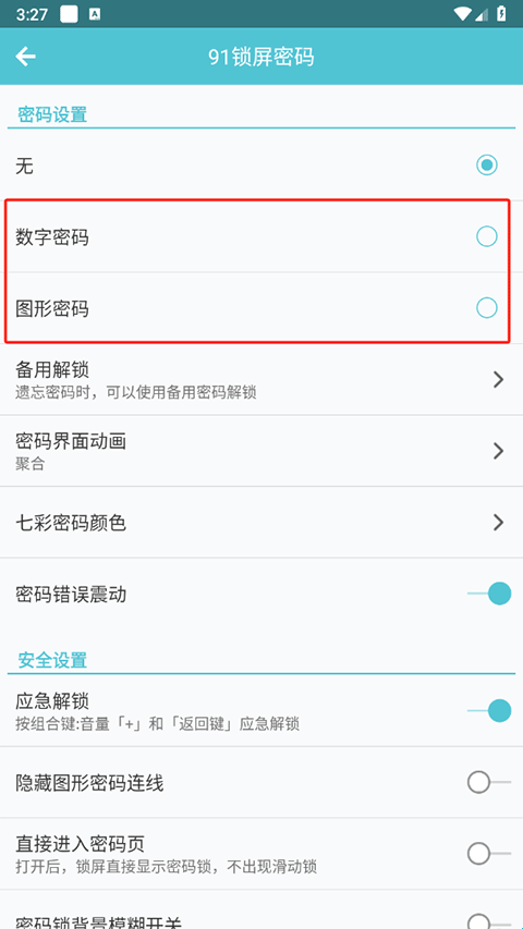 3、在密码设置页面可以看到数字密码和图形密码,选择一个自己喜欢的就行;