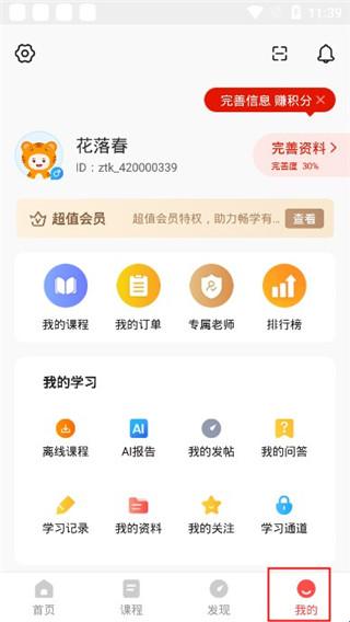 5、点击我的,里面提供了我的课程、我的订单、专属老师、排行榜等等功能。