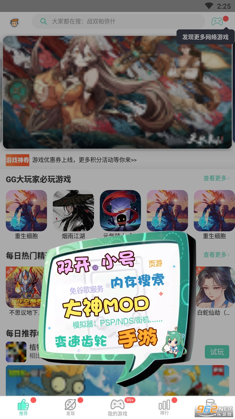《GG大玩家》是一款专注MOD的游戏社区平台。为玩家提供海量的游戏MOD,包括我的世界、放逐游戏-大逃杀、丛林法则等热门的游戏,免ROOT权限、免谷歌服务。同时还有新游推荐、玩家社区等,帮助玩家玩到你想玩的游戏!