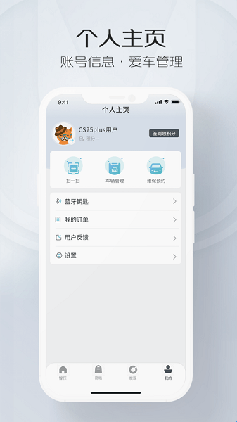 会员中心:支持长安车主身份认证,认证后可享受会员积分管理、专属活动参与、电子券查看与使用等权益,同时还支持会员推荐功能,让您与亲友共享智能车生活。