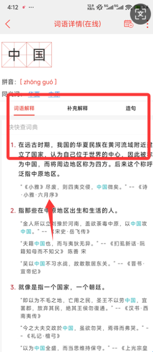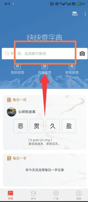 2、通过拼音、部首或手写输入你想查的汉字,即可看到该字的详细解释和读音。