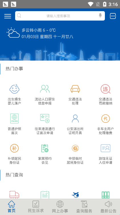 是一款便民警务平台,在信息化的社会中,移动化的警务平台发挥着越来越大的作用,山东民生警务平台就是为了方便广大居民在线咨询求助、业务审批、投诉举报的手机客户端,加强警民合作增加沟通了解的有效渠道!