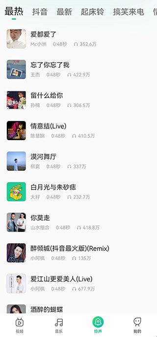 2、铃声:用户点击屏幕下方的铃声,之后就可以查看最热、抖音、搞怪等多种多样的铃声,随便选择一个铃声点进去之后就可以下载啦!