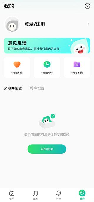 1、登录注册:进入之后,用户可以点击右下角的我的进行账号的登录和注册,之后就可以查看到自己的下载的铃声、视频等等。