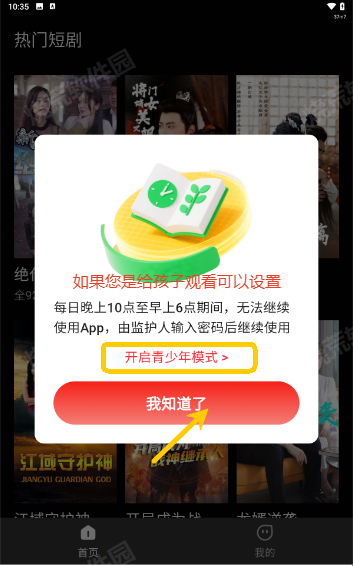 2、打开APP会出现青少年防沉迷提示,如果您需要给青少年观看影视资源,需要设置,如果不是可以点击“我知道了”;