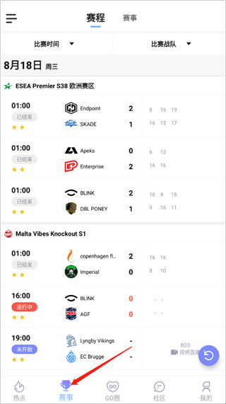 3、点击live,玩家可以观看所有的赛事视频和直播。