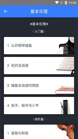 2、进入“基本乐理”可以看到入门篇、进阶篇等钢琴五线谱知识内容。