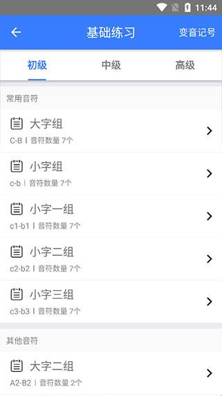 考虑到很多刚接触五线谱的用户遇到这么多钢琴键而不知所措的情况,我们针对性的将基础练习分级。在初级中我们将每个组别单独拎出来做练习,这样能让用户更好的练习和巩固。