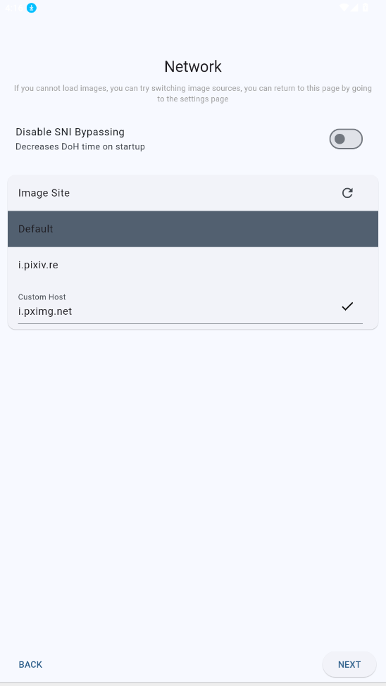 2、打开PixEz需要选择语言及网络,语言选择zh-CH即可设置中文,网络保持默认