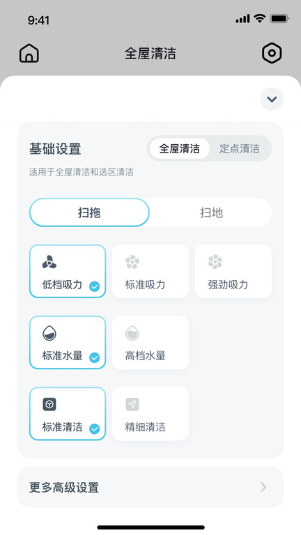 掌上调节拖地水量(具有拖地功能部分机型适用):粗糙地面调大,光滑地面调小,水渍无所遁形