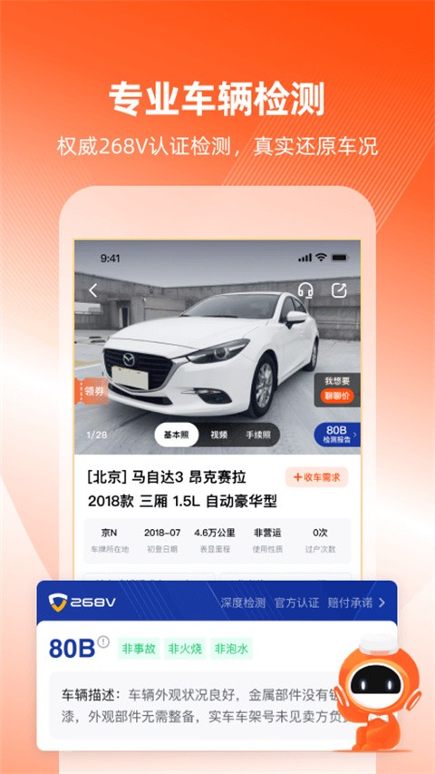 1、专业检测:自有"268V二手车标准化检测"专利技术,完美还原真实车况。