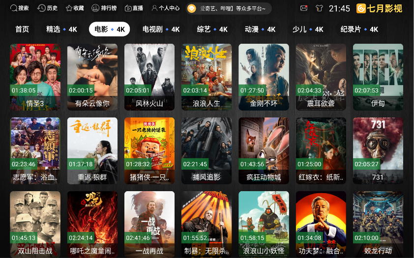 七月影视为用户打造一个无需会员、无广告干扰的观影环境,聚合了来自多个来源的影视资源,用户可以通过关键词快速找到相关影片,并支持按分类筛选、专题榜单查找,更新速度也很快,让用户无需等待,第一时间追剧,同样也支持跳过片头片尾、倍速播放哦。