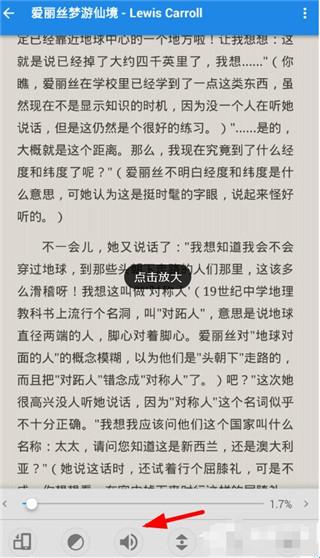 2、在点击进入了“爱丽丝梦游仙境”小说详情页面后,点击屏幕中央唤起菜单,选择下方列表里的声音按钮,从而设置朗读;