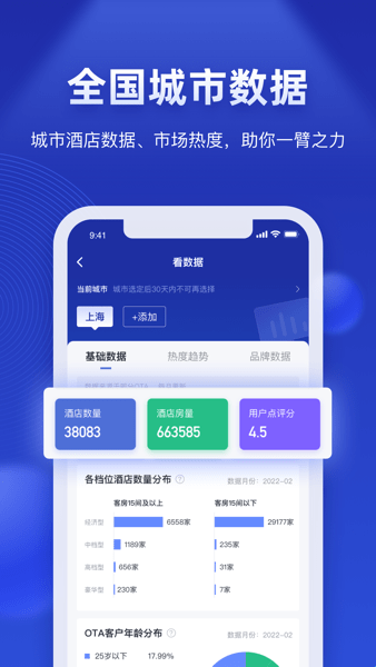 1、看数据:依托市场海量数据,计算全国各城市酒店市场热度、出行热度、房价变化等,并提供各城市酒店分析数据、用户画像数据等,为您的决策提供更多依据。