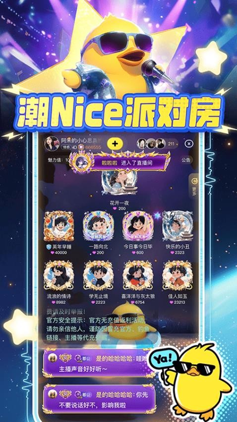 一键加入与互动聊天:用户只需一键即可加入感兴趣的派对房间,无需繁琐的注册和验证流程。在派对房间内,用户可以通过语音、文字、表情等多种方式与陌生人进行互动聊天,轻松开启交友模式。