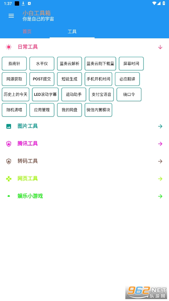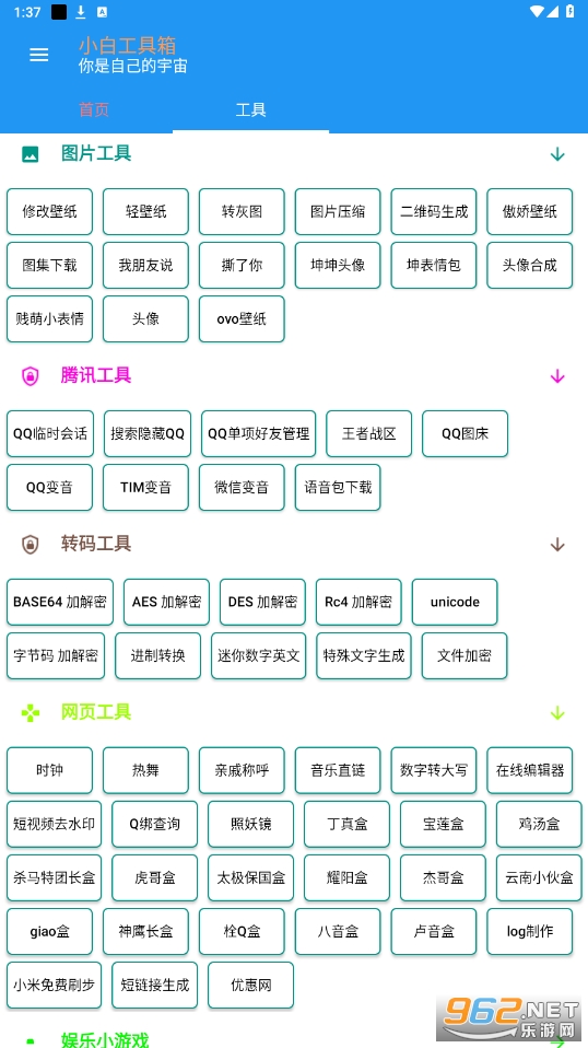 《小白工具箱》是一款集日常工具、图片处理、腾讯专属功能、转码、网页助手及娱乐小游戏于一体的多功能应用。无论您需要快速处理图片、管理文件,还是进行格式转码、网页辅助操作,甚至想要放松心情玩些小游戏,小白工具箱都能满足您的需求。其界面简洁易用,功能丰富多样,是日常生活和工作的得力助手。