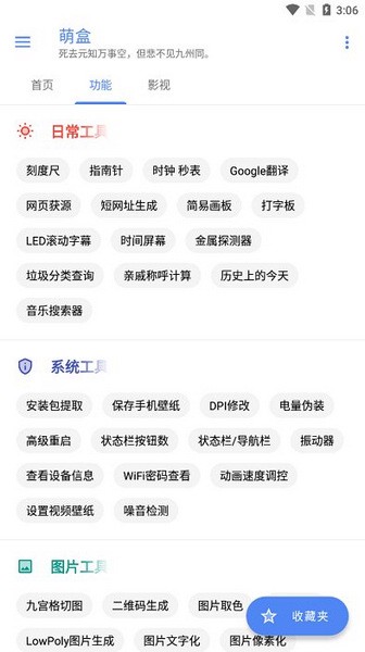 萌盒手机版这是一款专业、实用的手机工具软件,它有着简洁而又强大的界面,一秒钟就能开启和使用,有很多实用的小工具都可以从其中选择使用,日常、系统、图片、查询、提取等资源,能够让不同的使用者朋友们,都能很好地满足他们的个性爱好和需要!喜欢就点击下载体验吧!