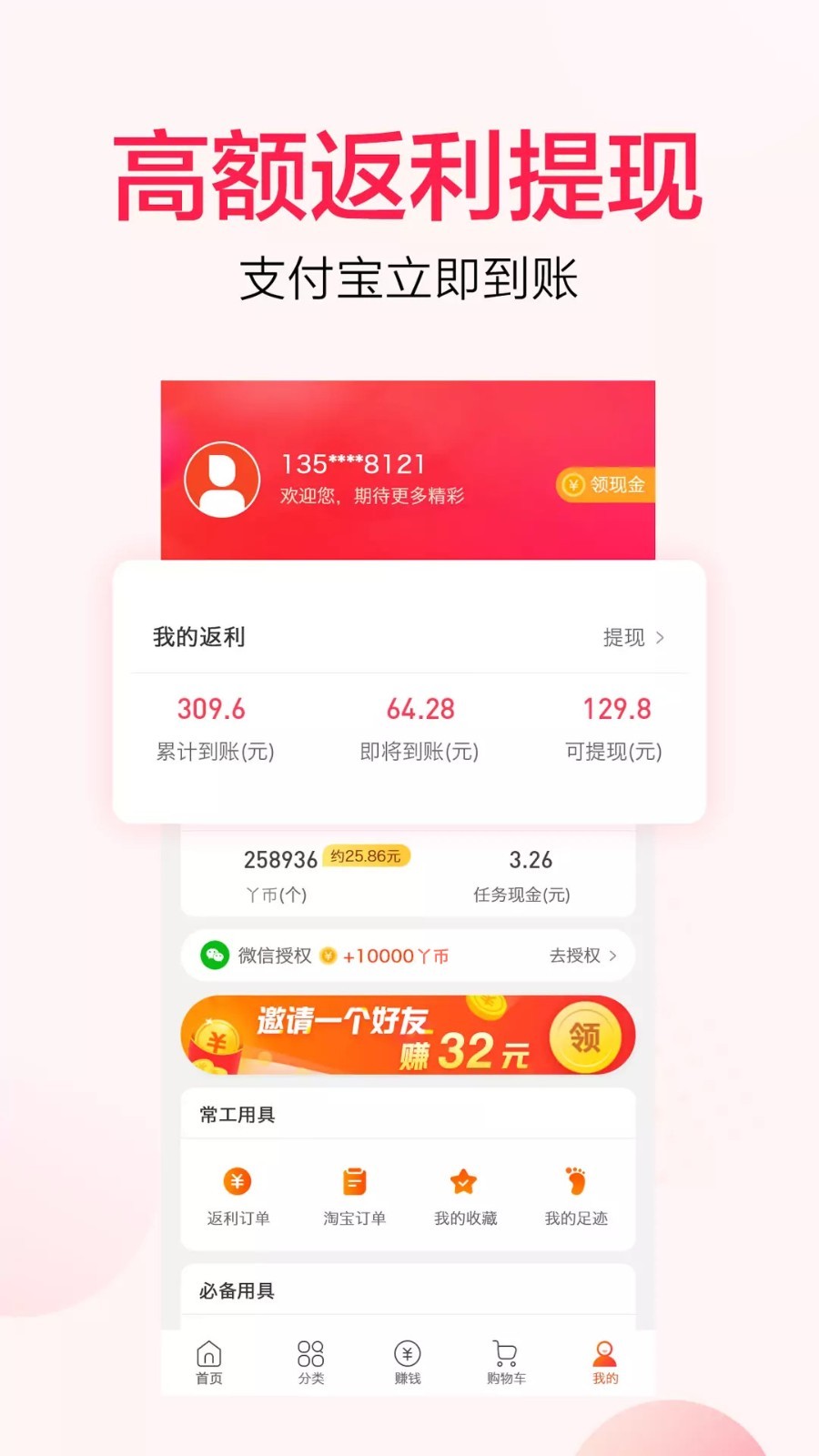 1、个人中心我的返利栏拥有多种数据,这些数据包括累计到账、即将到账以及可提现的金额数据;