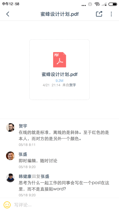 文档协作:提供云盘功能,让您可以备份您电脑中的档案,同步所有文档,在 PC 与移动客户端随时查询档案;与团队成员进行文档协作共享,指定团队成员的文档查看与下载权限,通过蜜蜂消息发送大型档案链接,不用担心文档过大问题。通过讨论组进行文档讨论。所有文档可以聚合保存。管理员可以管理组织内的文档管理权限。