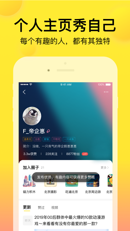 无论你是喜欢旅行、美食、摄影、时尚还是音乐,微趣App都能满足你的个性化需求。你可以通过微趣App分享你的旅行足迹,记录美食探索的旅程,展示你的摄影作品,分享你的时尚穿搭,或者推荐你喜欢的音乐!