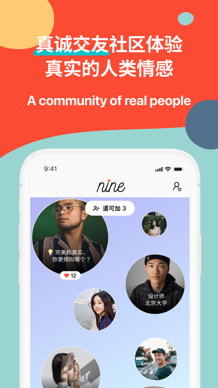 nine你呢交友是一款玩法独特的社交应用,汇聚了来自各个地方的高质量年轻人,都是实名认证过的,每天推荐9位有趣的ta与你相识,同时为了提升更多社恐用户的体验感,大家可以通过匿名形式与TA互动!