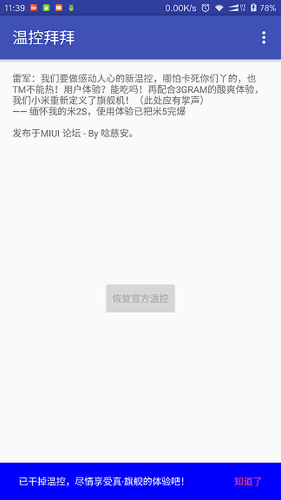 2、与【改温控文件】方式相比,优点是不需要第3方REC、无需解锁system、即时生效&还原、无需重启、不影响OTA升级(使用MIUI官方ROOT时,内测/体验版福音),但需要授予本程序ROOT权限(BL锁机型要先解锁BL);