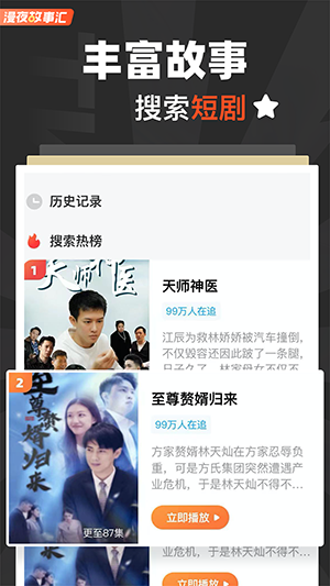 漫夜故事汇短剧是一款拥有海量短剧资源的软件,如今,越来越多的人喜欢看短视频,因为不仅可以在最短的时间内观看较长的剧情发展,还可以看到很多精彩的剧情故事!感兴趣的小伙伴,赶快来下载体验吧!