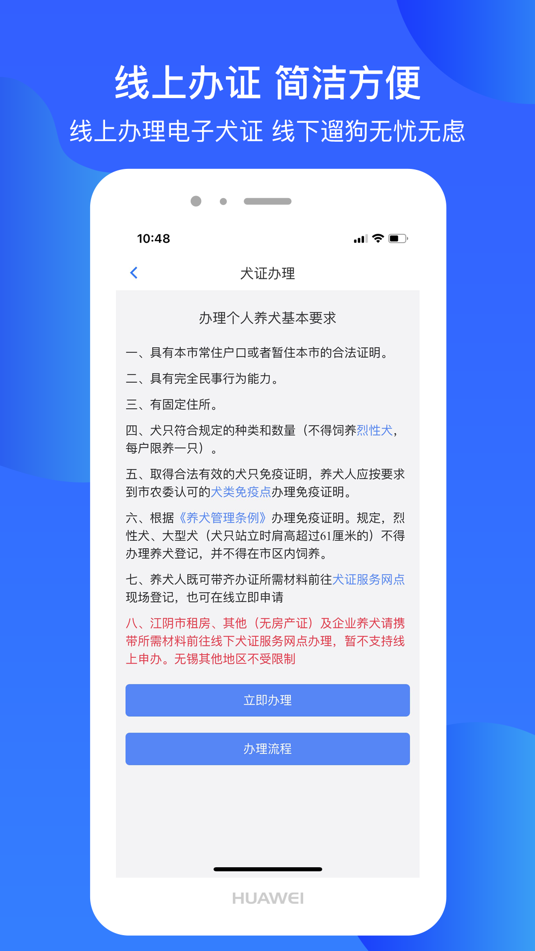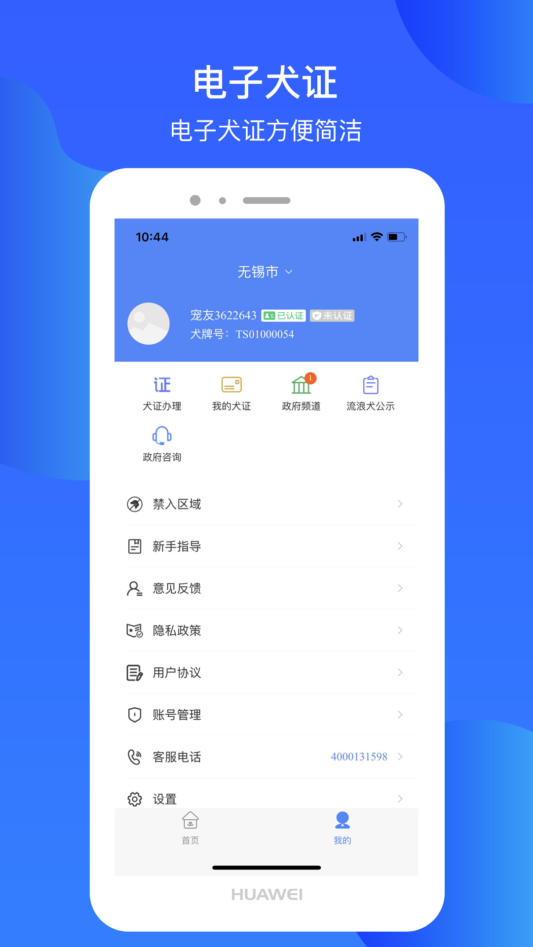 在线申请办理犬证,等待政府人员审核,领取合格的电子犬证。实时知悉违规记录、养犬法律法规、禁入区域、免疫点、办证点、禁养犬只等信息。