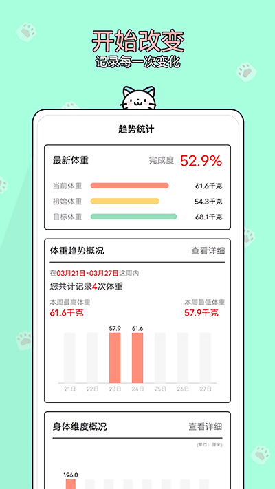 7、自动计算BMI,了解身体健康质量指数和体脂变化。