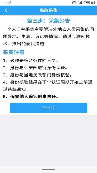 5、中间两步注意事项,来到第四部进行人脸采集,采集完成等待民政工作人员审核,处理完成后将结果通知用户