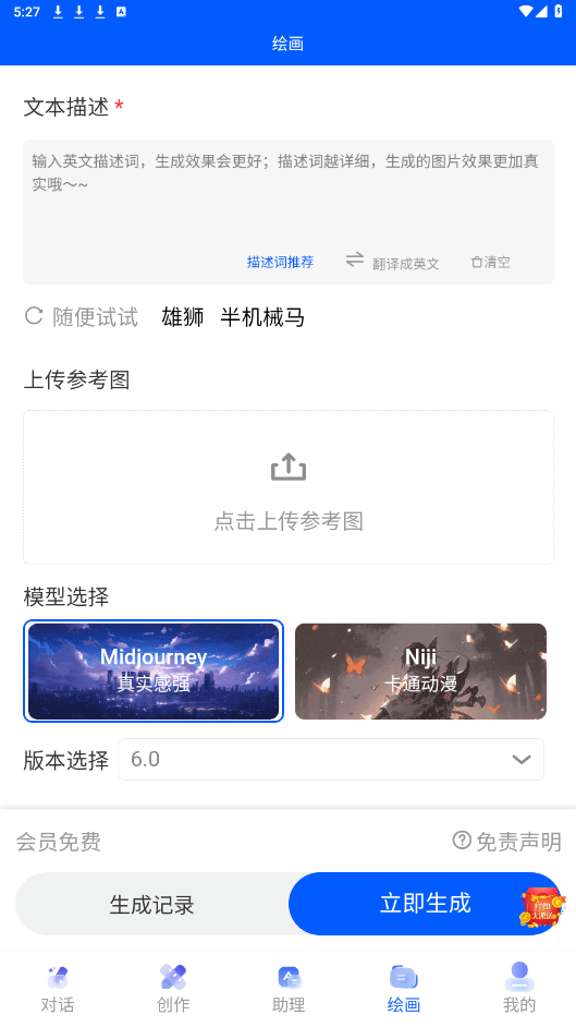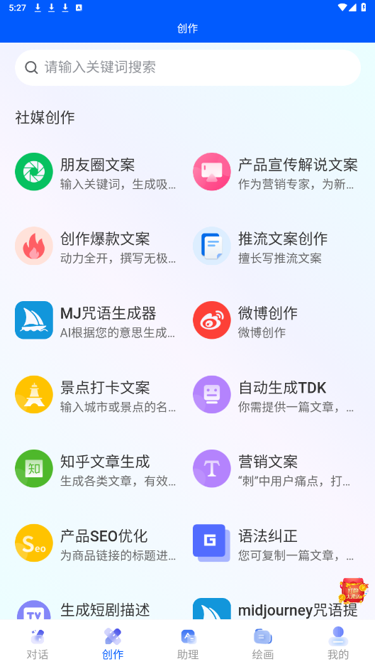 2、只要输入关键词就可以生成你想要的内容了,不管是绘画还是文案都有,还支持二次编辑。