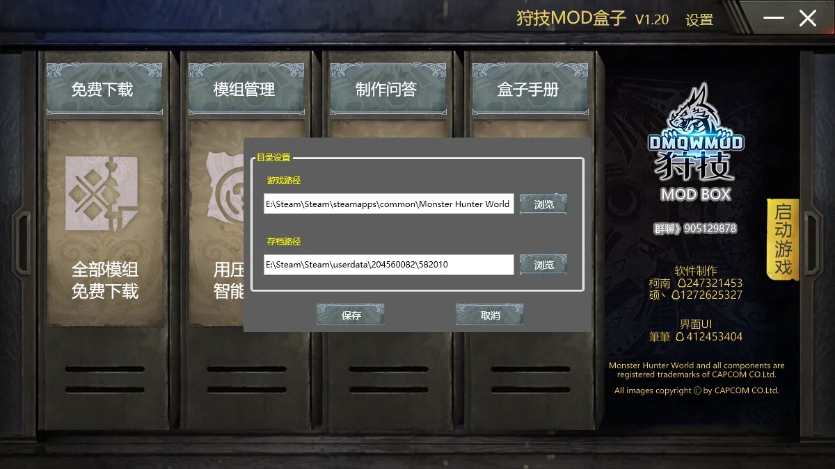 第一次打开盒子的时候,会弹出游戏路径的设置,这时候这需要浏览你的游戏根目录,选择文件夹之后点击保存即可,狩技盒子主要分为四个小盒子,第一个盒子是免费下载MOD,由于服务器尚未搭建好,所以这段跳过,第二个盒子是智能MOD管理,支持一键智能更换同类武器和一键更换服饰外观,是不是超赞,就连外国人都没有,就我们国人独享的MOD盒子呢!