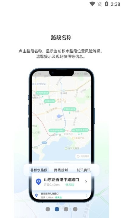 点击路段名称,显示当前积水路段位置风险等级,温馨提示及现场快照等信息。