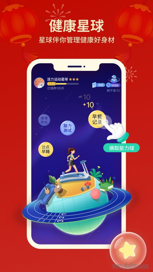 以世界卫生组织提供的全球公认健康作息为标准,制定五条故事线计划,领取你的专属星球,在养成星球的过程中轻松养成健康好习惯。