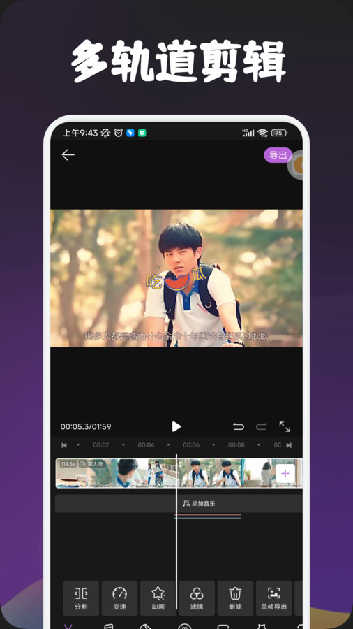 3、丰富的音频选项:搜片视频剪辑支持添加背景音乐、音效以及录制或导入自定义音频,使得视频更具有个性和吸引力。使使用者能够在任意一段录像中加入个人风格。