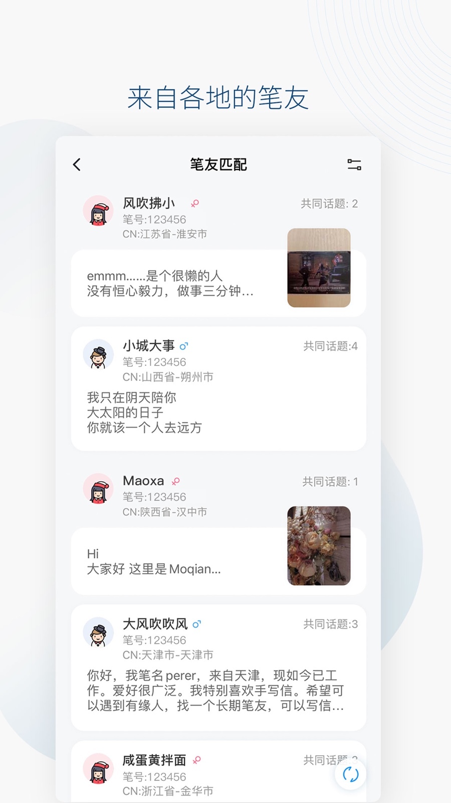 提供了一种不同于主流社交方式的交流方式,通过书信和明信片的传统方式,让社交回归到更加慢节奏的生活方式。这款应用让你体验到传统社交方式的新奇和有趣,享受到别样的社交乐趣。每天它都会为你推荐一定数量的用户,让你选择与你感兴趣的笔友建立联系,体验不同寻常的社交方式,并在信息时代中感受到传统社交的乐趣。