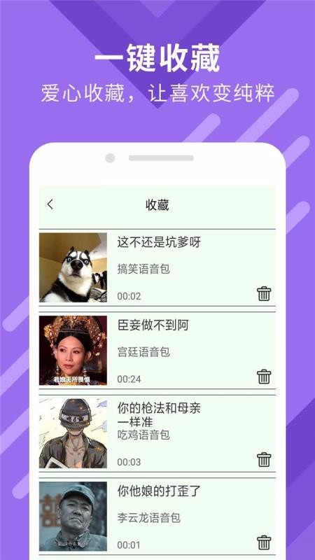 拥有卢姥爷、张大仙、李云龙经典语录、二次元萌妹、抖音趣味段子等当下超火的语音包,你想要的都能搜到;