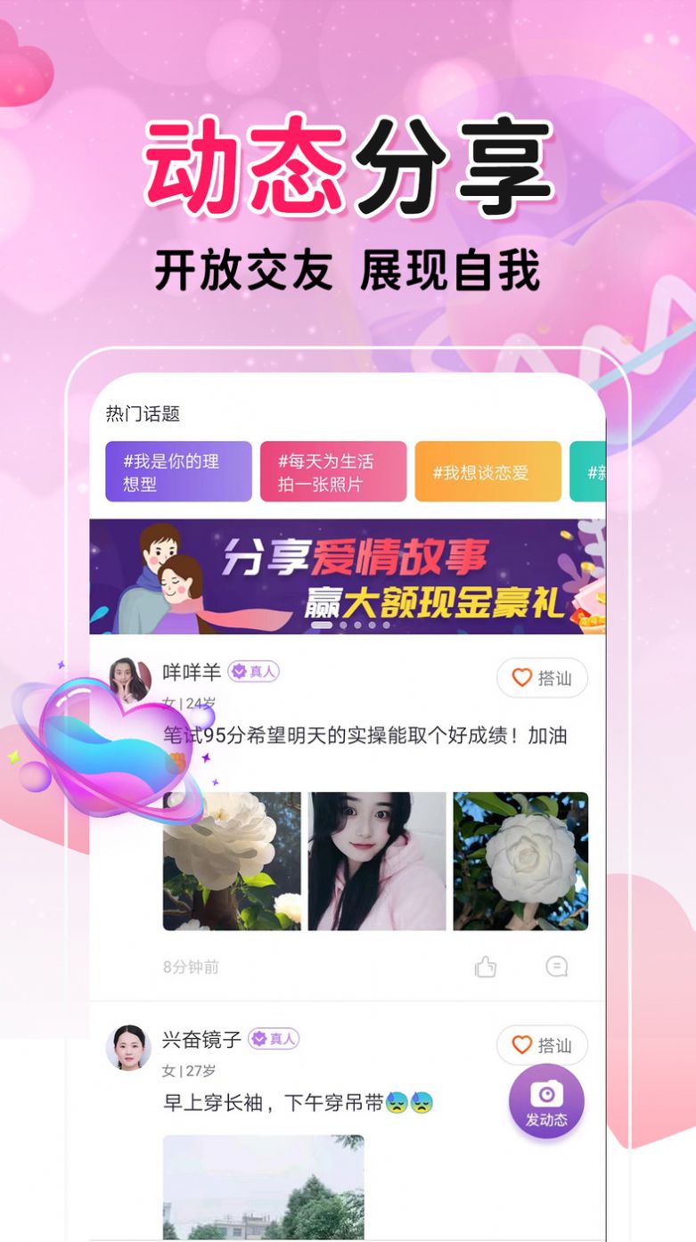 3、动态分享模块,用户可以通过发布图文内容、参与评论或点赞等方式活跃社交圈。