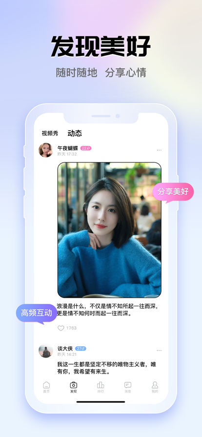 1、不同的社交方式让更多的人群轻松交友,一步步拉近人与人之间的距离。