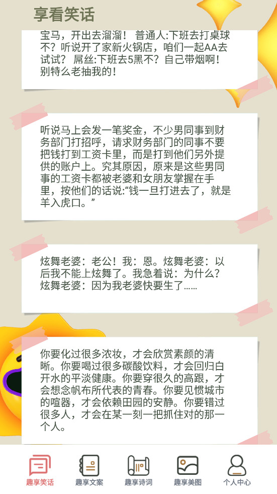 《趣享乐刷app》是天津清源互动科技有限公司推出的一款精彩图文阅读软件,朋友们可以选择笑话、文案、诗词、美图不同的目录去使用,从搞笑段子到心灵鸡汤,从创意美图到深度好文,趣享乐刷承诺,让你的每一次滑动都充满惊喜。
