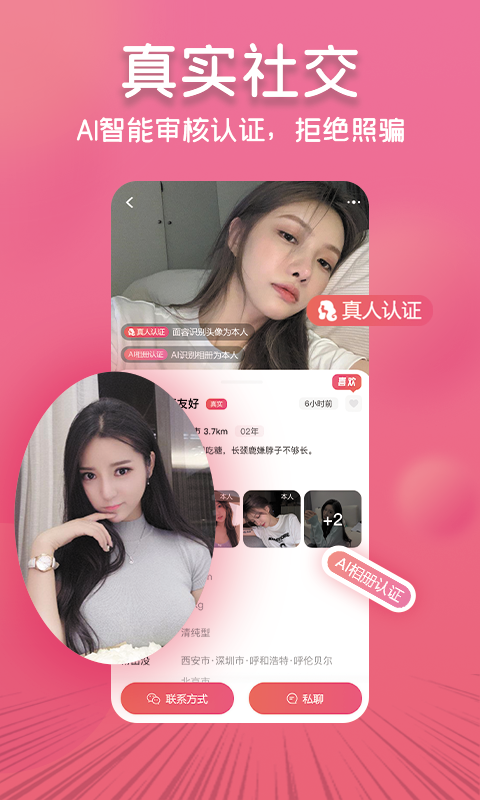 甜蜜之约app是一款备受用户喜爱的社交互动软件,所有注册用户均需通过严格的视频认证审核,确保资料的真实性,杜绝任何形式的照片伪造行为。让用户在交友过程中更加安心、放心。如果你也想体验真实有趣的社交乐趣,不妨立刻下载甜蜜之约app吧!
