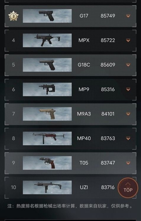 2、热度榜单呈现:清晰列出所有枪械的热度排名,精准推荐近期最受关注的武器型号;