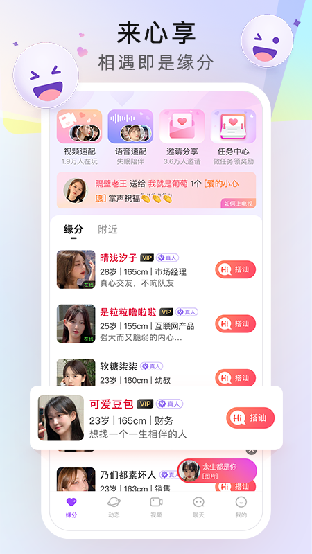 心享是一款手机同城视频聊天交友app软件。这里将众多关于社交方面等多种强力功能全部融合在一起,实时提供给用户超级多且十分爽快的社交体验。