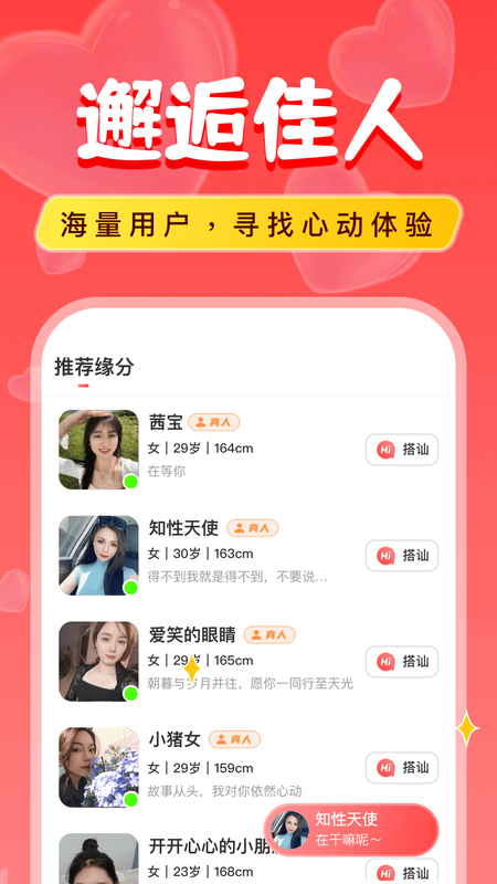 1、随时在线匹配自己喜欢的类型,用户信息真实可靠,可以放心交友和社交恋爱互动;