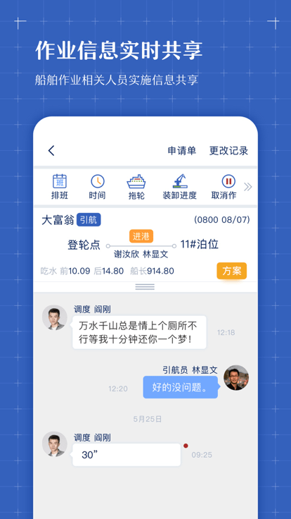 申报提交后随时确认引航作业时间、增加新的作业动态、安排拖轮等。