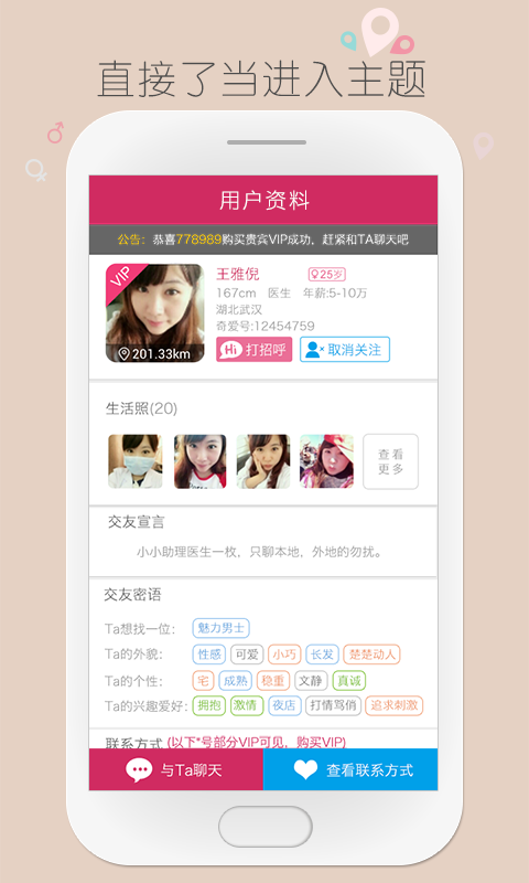 1.【主题匹配】设置一个交友主题,推送全网在线异性,聊你想撩;
