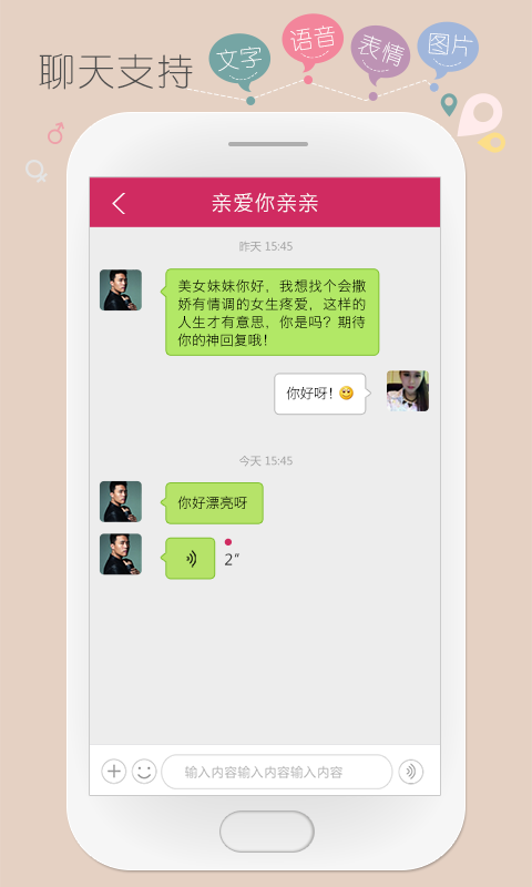 4、聊天:女性会员可以随时随地向自己心仪的男性会员发送文字或语音信息,即时沟通,畅聊无限;男性用户通过获取成为VIP会员,亦可以随时随地向自己心仪的女性会员发送文字或语音信息,即时沟通,畅聊无限。