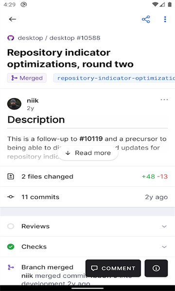 作为开源软件的「大本营」,交流代码、公开新版本都是很重要的任务。在这一方面,GitHub app 将其视为一种社交行为。因此,他们设计的 app 就允许人们像回复帖子一样,对于某个新的改动进行评价。此外,颜文字也被加入,让人们的交流更轻松愉快。